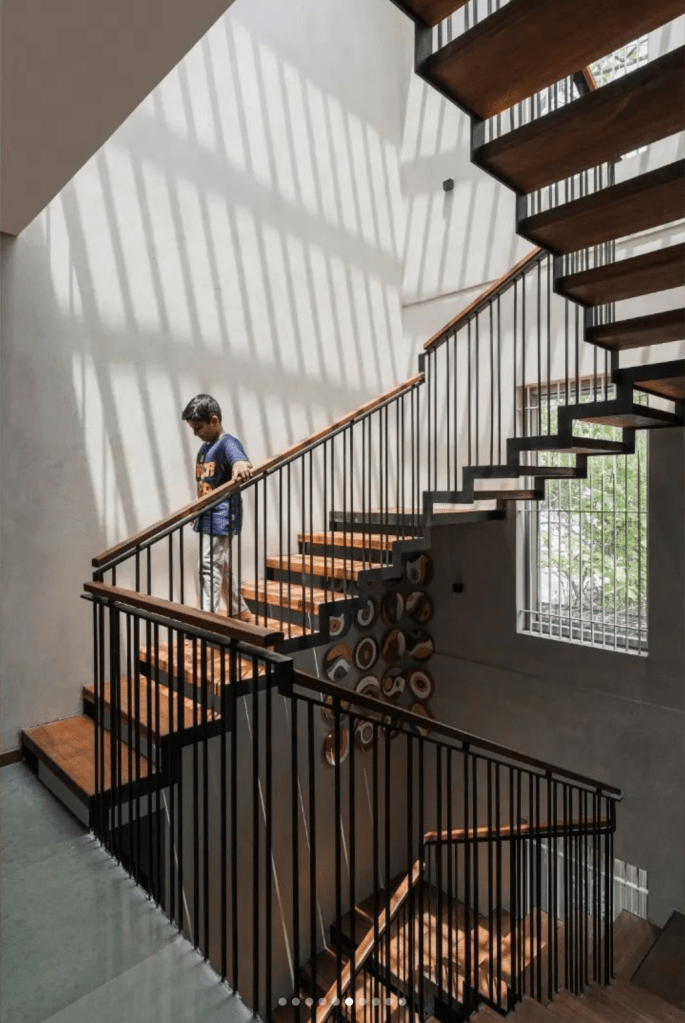 The ground floor spreads into common areas, including the living room, kitchen area, and dining room. The main attraction of the ground floor is the steel staircase with solid wood bars on top of the railing and the indoor pool beneath it. The water in the pool is constantly flowing in rotation, assuring there is no room for stagnation and the problems that come with it. Despite living in the house for months now, the novelty of it hasn’t worn off the kids of the house, who are still excited by it and spend their time playing around it. The skylight lights the staircase using a terracotta bricks jali frame-like structure. The result is an endless combination of shadow patterns as the day passes, and the house is naturally lit.